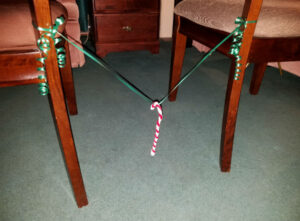 If you’d like to add a little active fun to your Christmas gathering, you might want to try out this game. You’ll need at least about 7 feet by 9 feet of empty space, preferably in the middle of the room where most of the guests are seated. Players on each team take turns aiming for the ribbon, to see if they can hook the cane on the ribbon for 5 points, or at least touch the ribbon for 1 point.