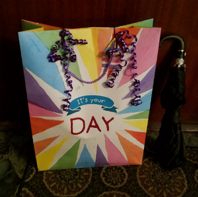 When the weather turns wet, the usual custom of making tissue paper pop out of the top of the gift bag sometimes seems rather impractical. Soggy tissue paper isn’t pretty. I sometimes managed to dig up a large plastic bag bigger than the gift and tissue, but that usually crumpled the tissue. Then when I took the gift bag out of the plastic bag, I had to try to fluff up the tissue paper to its former glory.
