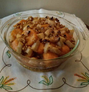 Sweet Potatoes is one of those dishes people seem to either love or hate. It’s a “must-have” dish for Thanksgiving dinner for those who love them. Most everyone has tasted the marshmallow-topped variety. Maybe you’re ready to experiment with something different. Here’s a recipe you can try. Be careful not to leave it in a little too long, as I did. As you can see, the nuts became a little “overly-toasted.” (That sounds better than slightly burned, doesn’t it?)