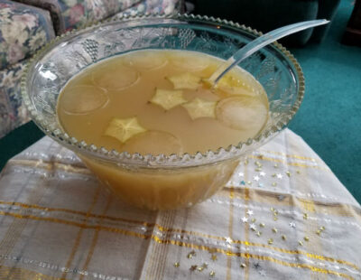 Experts say you should trim off the brown edges of the tips of a star fruit with a vegetable peeler. Cut the ends of the star fruit off and discard. I make the slices about ¼” thick. Use the tip of a knife to take out the seeds. The second time I went to buy a star fruit at the store where I shop each week, I was surprised to see that the price of a star fruit had skyrocketed. Hopefully that won’t be the case for you. Oh, well . . . Christmas only comes once a year. You shouldn’t need more than one star fruit. You could just put a few slices in the punch at a time, in case one of the guests decides to eat some. I suppose it would be a little tacky to put up a sign that says, “Please don’t eat the star fruit.”